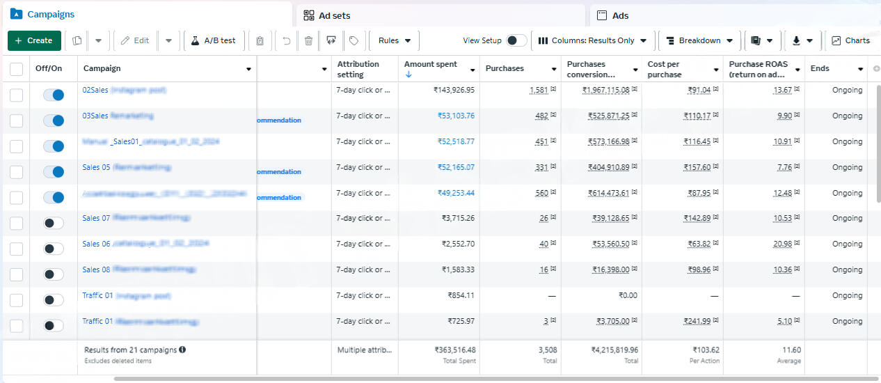 We crafted strategic offers like bundled deals and sales promotions to boost AOV and encourage higher-ticket orders. Sharp audience segmentation ensured we reached high-intent buyers, achieving a CPM of ₹97 (below the industry average). Engaging ad creatives delivered a CTR of 3.18%, a CPC of just ₹3, and a cost per checkout initiation of ₹28. With these optimizations, we scaled the brand’s campaigns, driving 3,508 purchases at a total spend of ₹3,63,516.48. This resulted in ₹42,15,819.96 in revenue with an exceptional ROAS of 11.60X. The brand successfully broke through growth barriers in a challenging market, leveraging higher AOV and cost-efficient strategies to scale profitably.